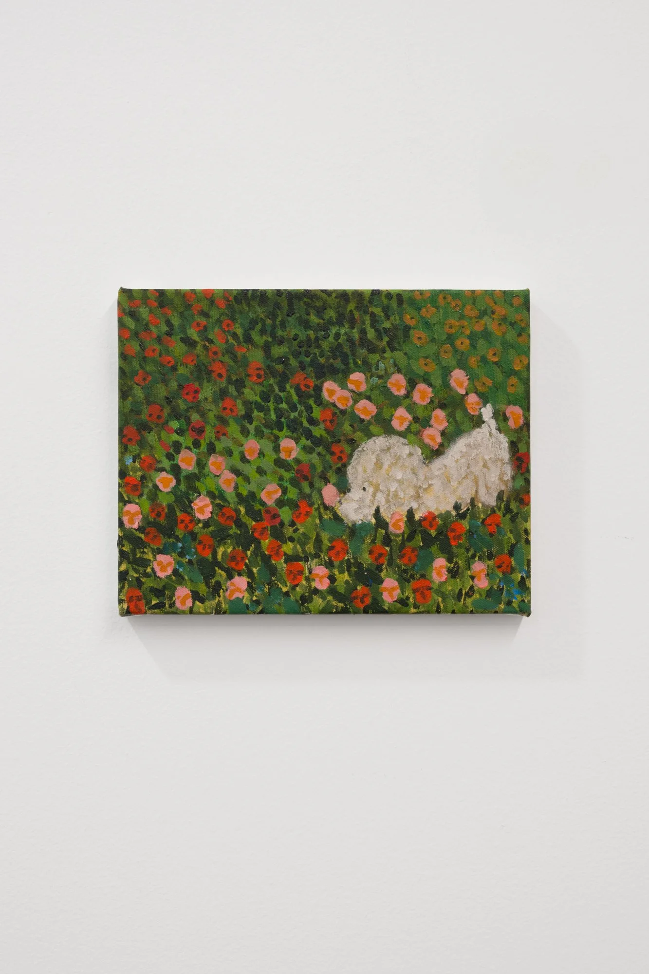 Throughout the exhibition Green Fuse, Milbrath pursues tulips and her experiences at Keukenhof and later to Skagit Valley, in Washington state, which is captured in the video work Tulips (2025). In the first tulip works she created, Milbrath rendered them by individually painting each flower, a process of almost manic mark-making that carries over into works in the exhibition like Keukenhof and Skagit Valley. This creates an intensive rhythm to the pieces that also mirrors the extensive labour involved in growing and maintaining these sites. The obsession and labour for tulips extends far back throughout human history, with significant peaks of adoration beginning in the Ottoman Empire of the 15th century—prolifically adorning imperial gardens and textiles as well as ceramics and masonry—and later during “Tulipmania” in the Dutch Republic in the 1630s, when a fixation on the flower resulted in a craze of disastrous speculation. A wild flower at heart, once tulips intersected with humans so began a love that came with controlled cultivation, excessively manipulating, regimenting, and valuing its growth while endowing it with great symbolic meaning, even becoming the official flower of the Protestant Reformation.