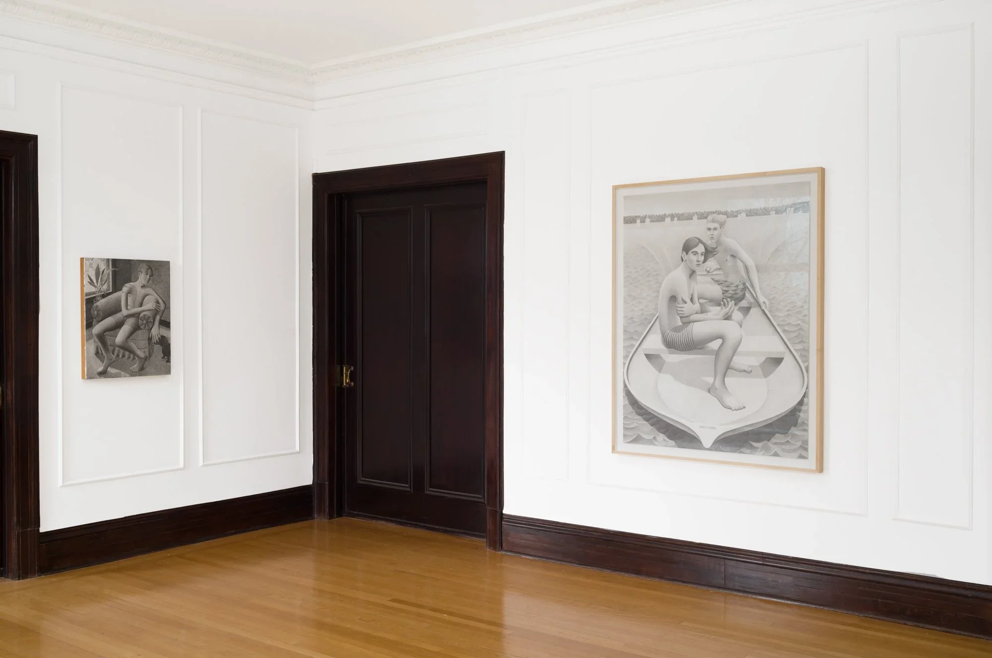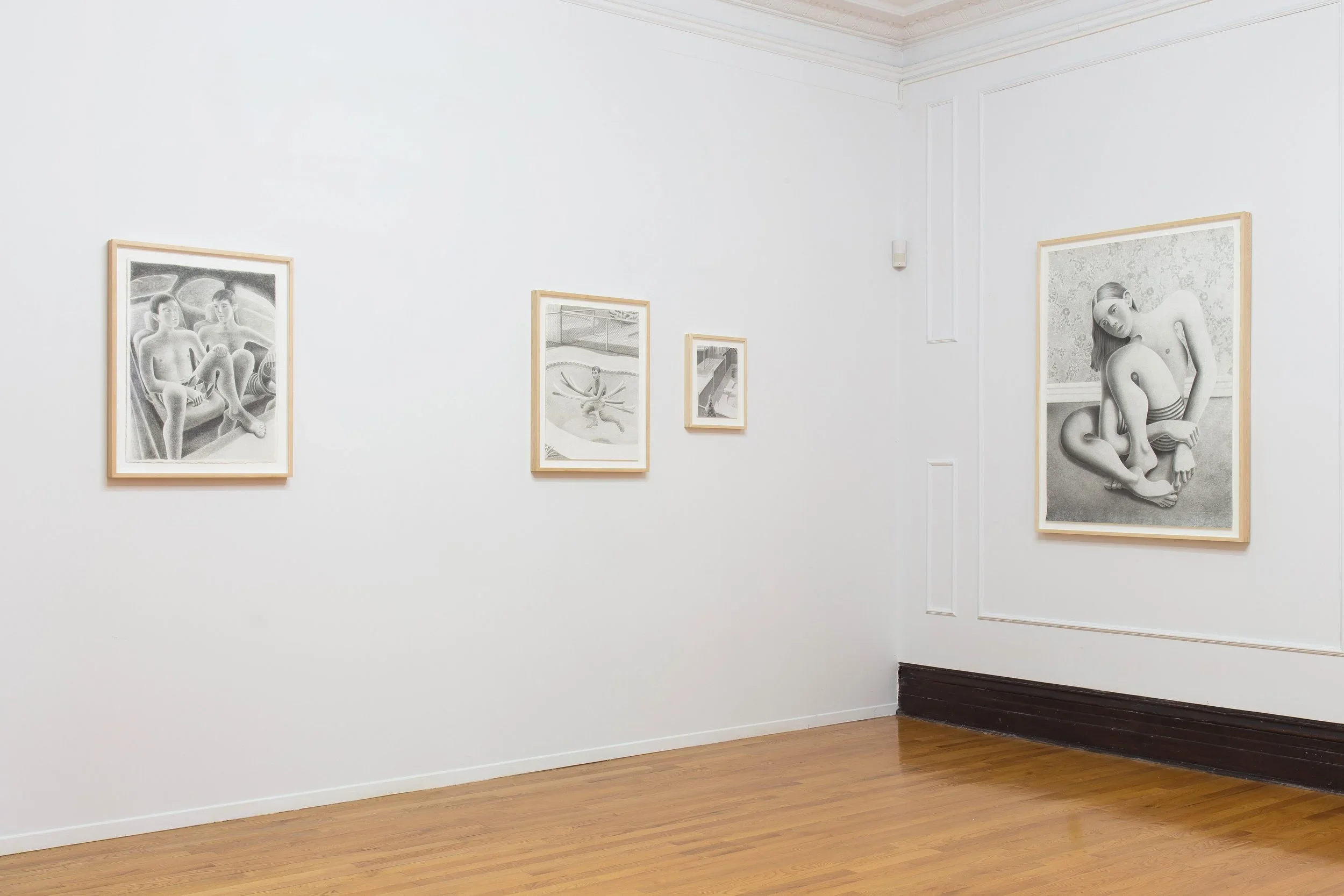 Russell Banx practice is dedicated to graphite drawing, embracing the immediacy and preparatory connotations of the medium as an end in itself. His work unfolds within an introspective and sensitive realm, depicting male protagonists on the threshold of adulthood, captured in moments of reverie or quiet intimacy, in porous relation to their surroundings. Banx’s approach, both meticulous and intuitive, weaves together observation and reminiscence, drawing on personal memory and a contemplation of the fragility inherent to masculine identity.